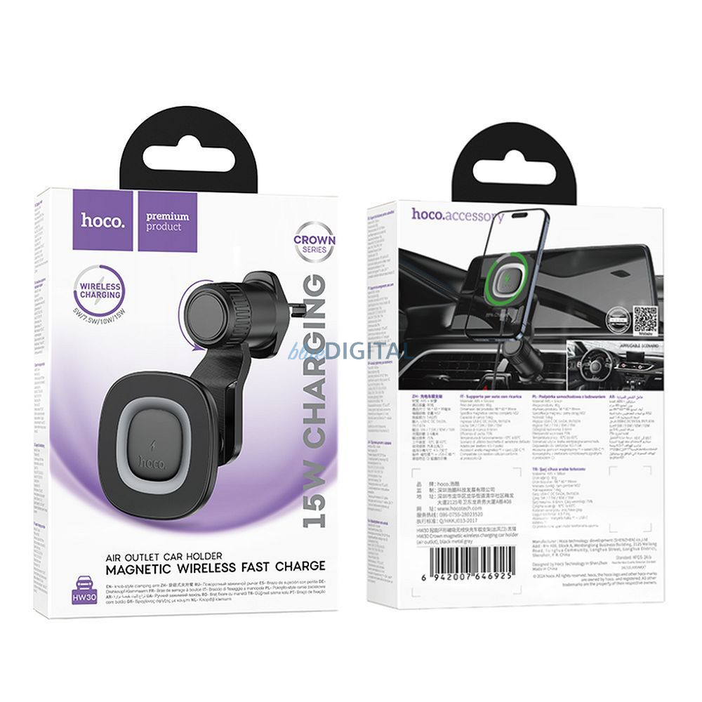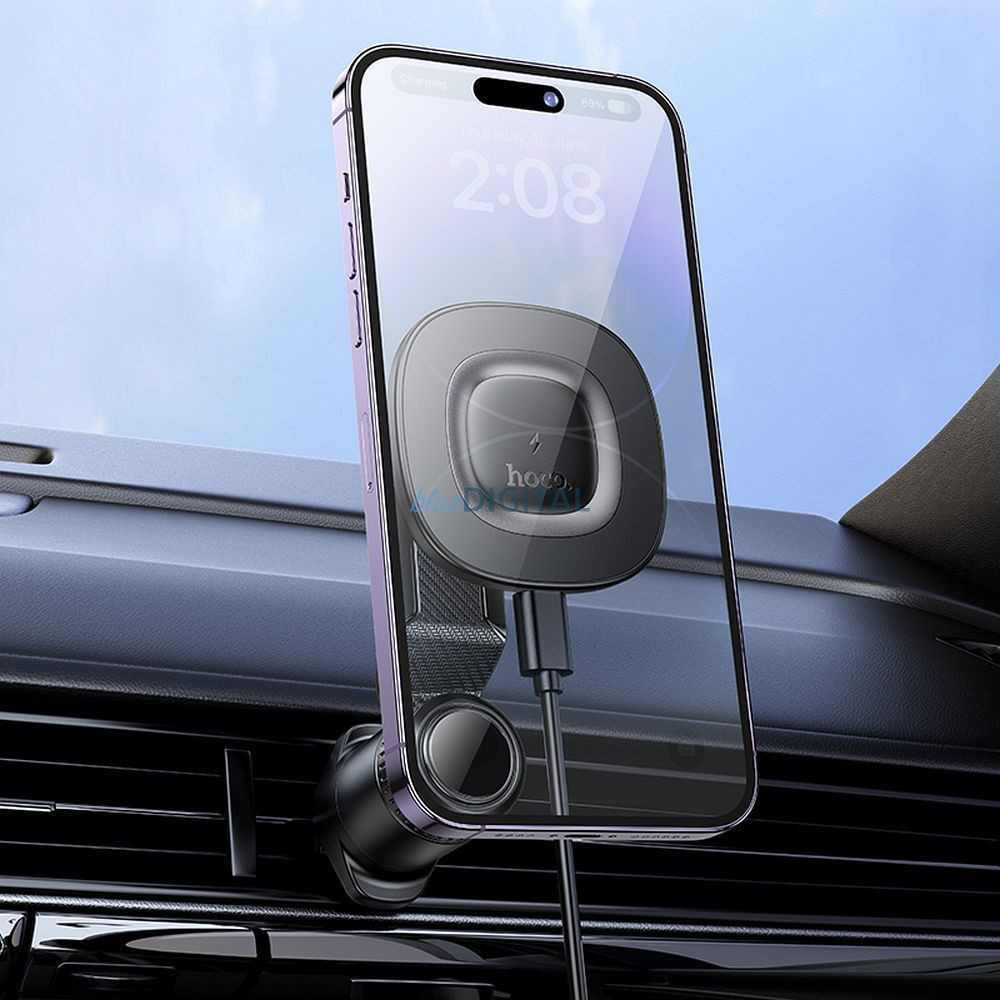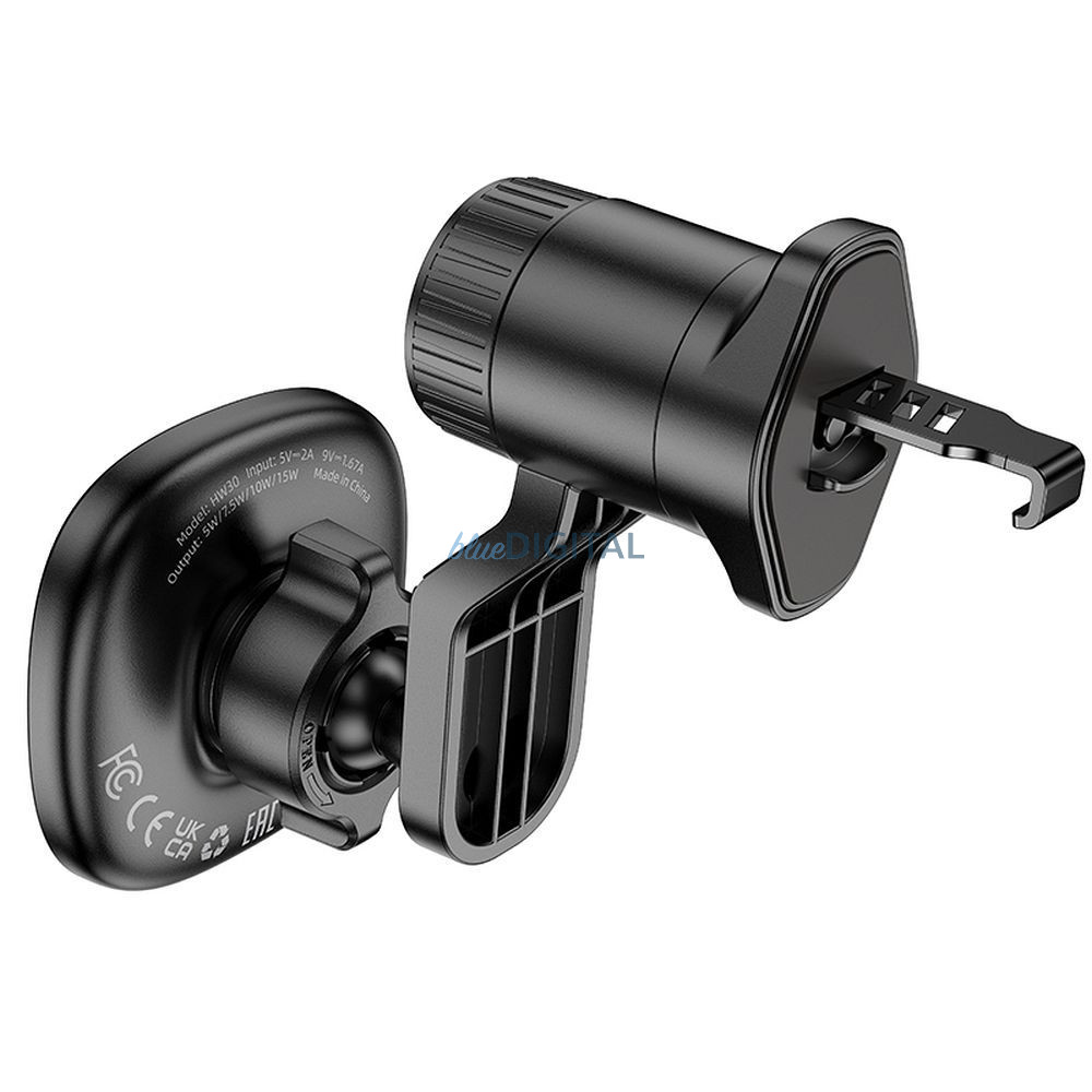A Hoco HW30 autós tartó 15 W-os induktív töltéssel egy funkcionális tartozék a szellőzőnyílásra való felszereléshez.