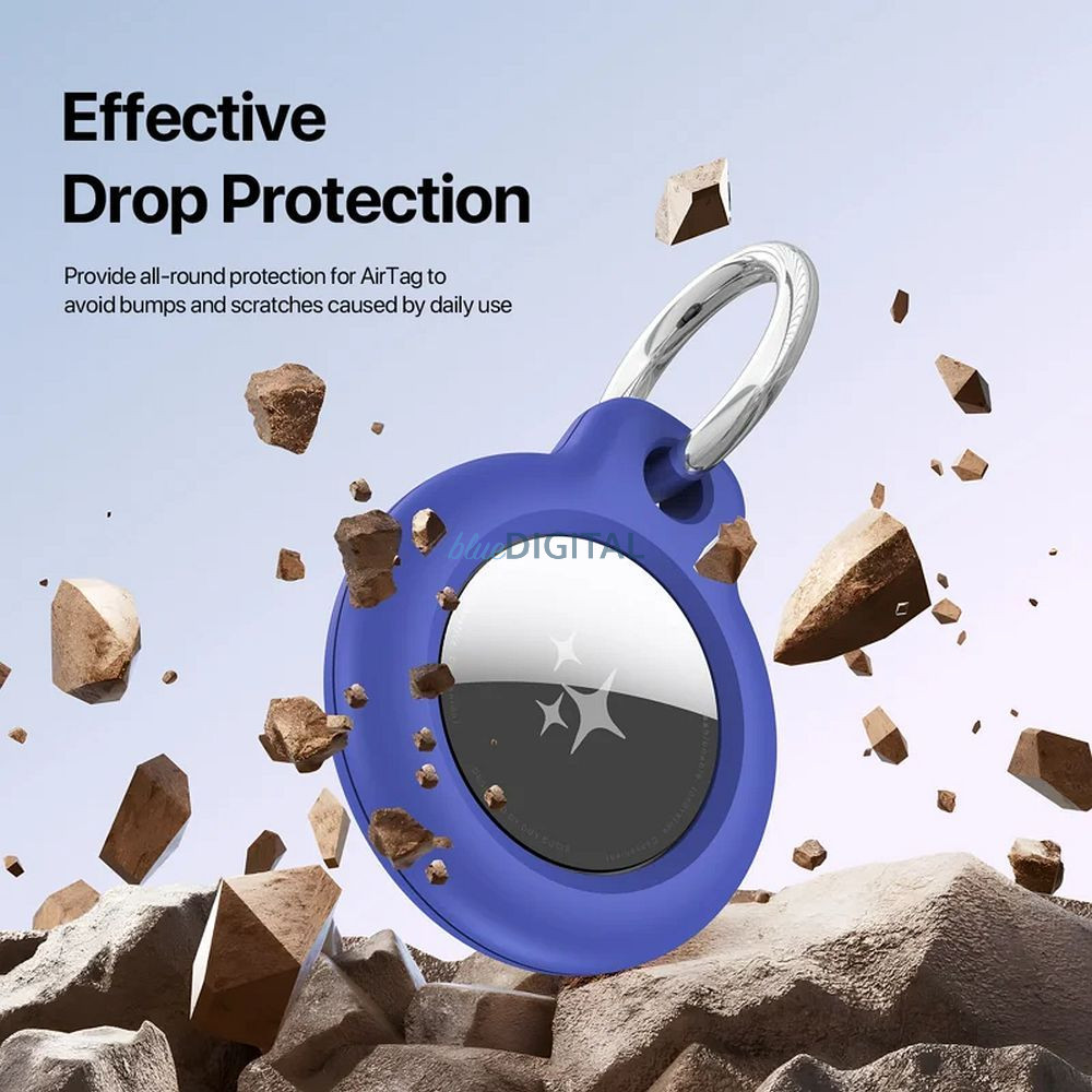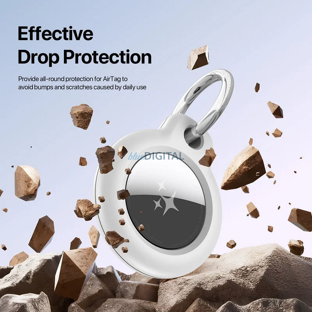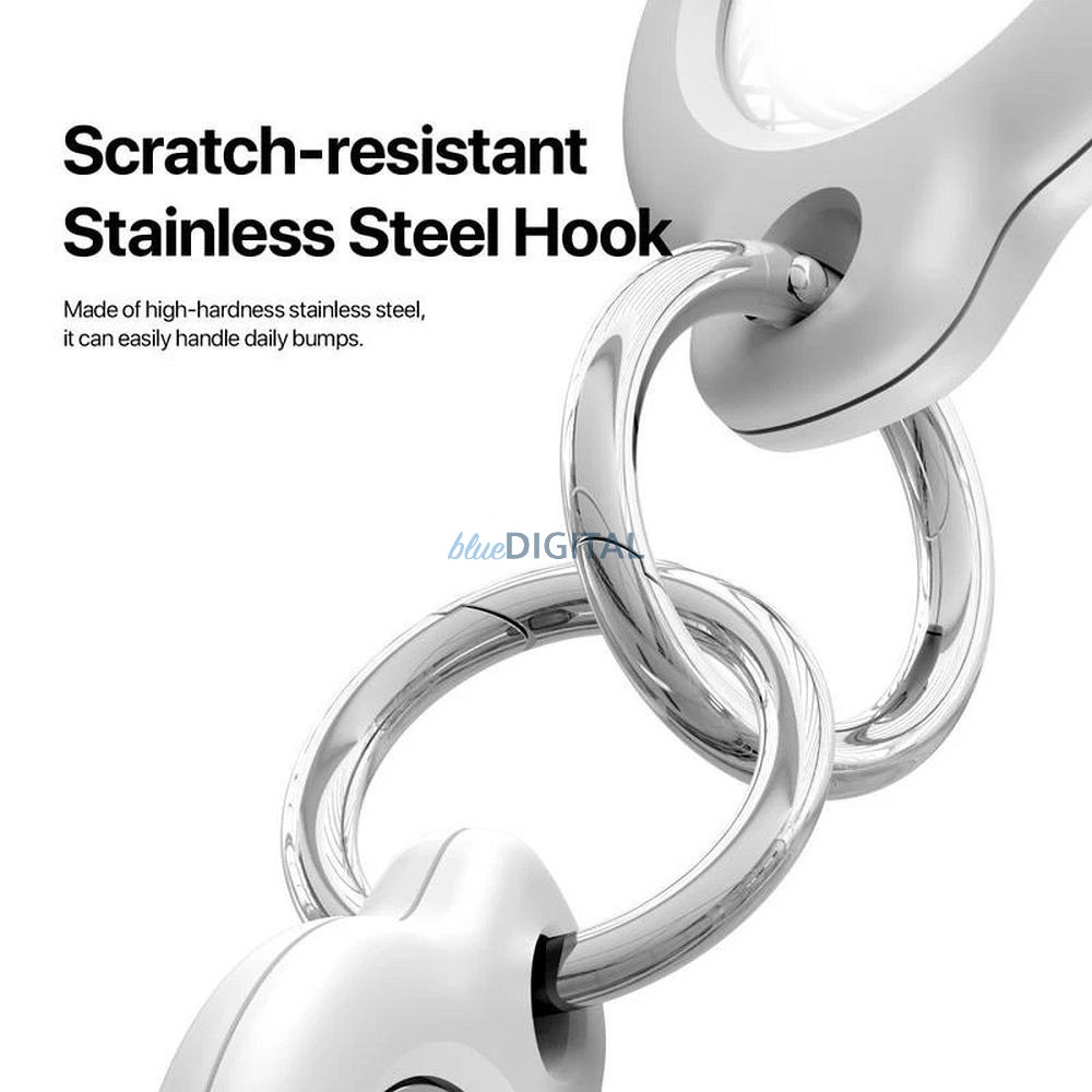 A rugalmas szilikonból készült tok ellenáll a sérüléseknek, és garantálja az AirTag könnyű felszerelését. A mellékelt karabinereknek köszönhetően a tok a lokátorral bárhová felakasztható, olyan tárgyakra rögzítve, amelyeket nem szeretnénk elveszíteni.