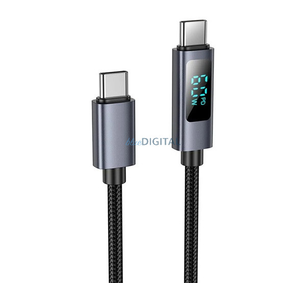 HOCO U112 adatkábel (Type-C - Type-C, 60W, PD gyorstöltő, 100cm, LED kijelző, cipőfűző) FEKETE