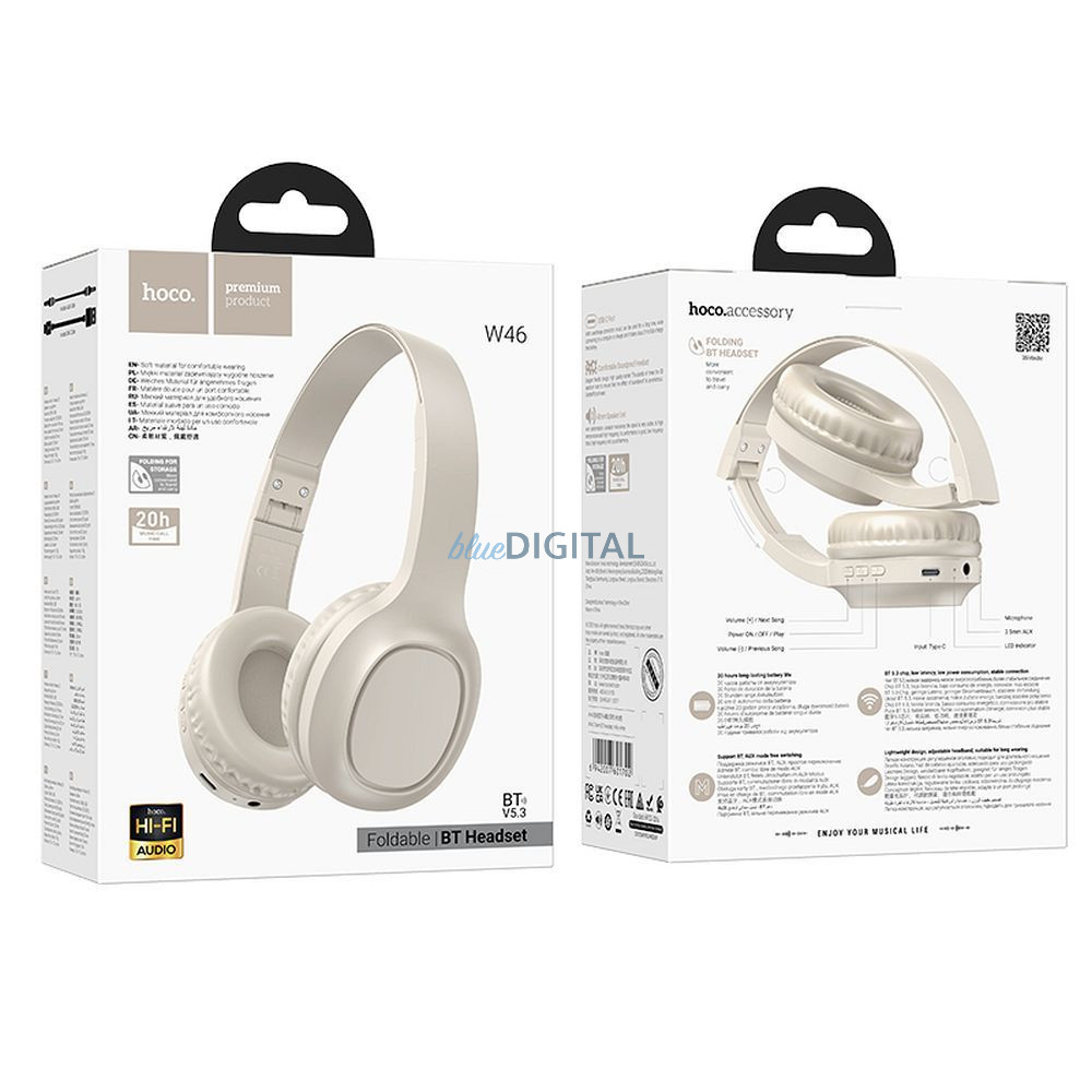 A Hoco W46 egy elegáns és kényelmes vezeték nélküli over-ear fejhallgató, amely tökéletes a mindennapi használatra. Bluetooth 5.3 technológiával felszerelve stabil kapcsolatot és alacsony energiafogyasztást biztosítanak. A 200 mAh-s akkumulátor körülbelül 2 óra teljes feltöltés után akár 20 óra zenelejátszást biztosít. A fejhallgató támogatja mind a Bluetooth-on keresztüli vezeték nélküli, mind az AUX-porton keresztüli vezetékes csatlakozást, így rugalmasan használható. Kompakt méretei és könnyű súlya (109 g) még hosszabb viselés során is kényelmet biztosítanak. A hangutasítások angol és kínai nyelven állnak rendelkezésre, megkönnyítve a készülék egyszerű kezelését.