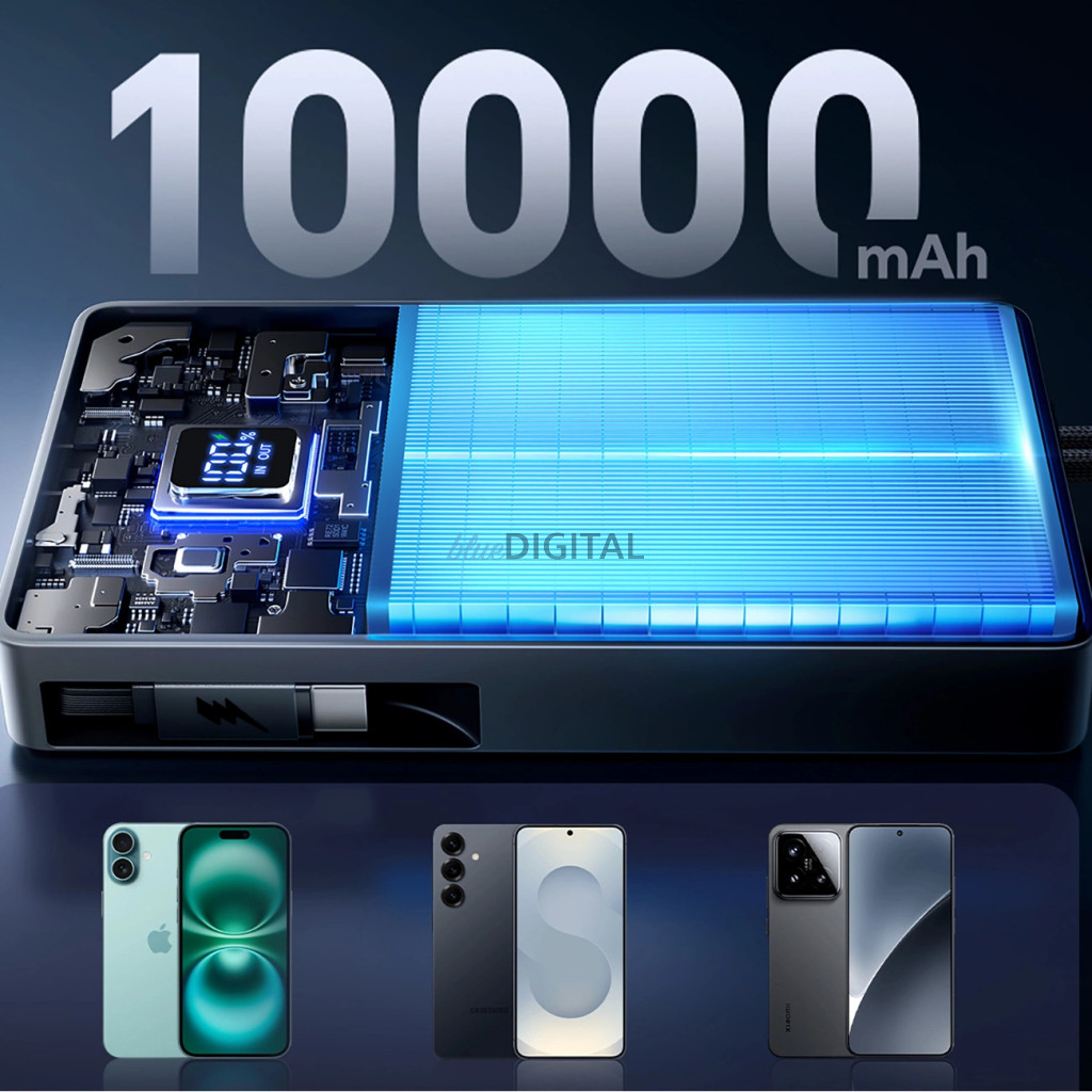 A Joyroom JR-PR1 Power Bank egy kompakt és hihetetlenül praktikus áramforrás, amely minden helyzetre tökéletes - az utazástól kezdve a napi ingázáson át a zsúfolt munkanapig. Beépített, 70 cm hosszú, behúzható mechanizmussal és 7 állású reteszeléssel ellátott USB-C kábellel rendelkezik, így kiküszöböli a kábelek összegabalyodásával járó gondokat, és további kiegészítők nélkül is kényelmesen tölthető. A 10 000 mAh kapacitással többszörös teljes okostelefon-töltést biztosít, és 22,5 W-os teljesítményével mindkét irányban támogatja a gyorstöltést - mind a készülékek, mind maga a powerbank esetében. A digitális kijelző valós időben mutatja a töltöttségi szintet és az üzemállapotot, így teljes körű ellenőrzést biztosít az energiaellátás felett. A Joyroom JR-PR1 támogatja a népszerű gyorstöltési protokollokat (PD, QC3.0, Huawei SCP/FCP, Samsung AFCP), így sokoldalú és megbízható mindennapi társsá válik. Emellett az alacsony áramerősségű üzemmód lehetővé teszi kisebb eszközök, például fejhallgatók vagy fitneszszalagok töltését.