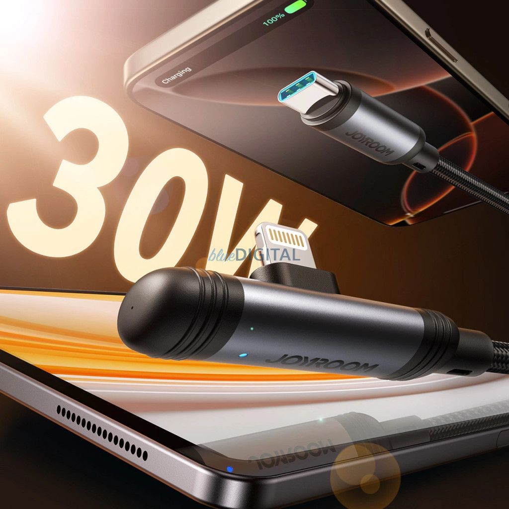 A Joyroom S-A56 az EnjoyX sorozatból egy robusztus 1,2 m-es USB-C - Lightning kábel, amelyet az Apple készülékek gyors és kényelmes töltésére terveztek. A 90°-os szögben lecsapott csúcs növeli a telefon használatának kényelmét töltés közben - ideális játékhoz, filmnézéshez vagy videohívásokhoz. A kábel akár 30 W töltési teljesítményt is támogat, jelentősen csökkentve a töltési időt. A megerősített csatlakozók, az alumínium kivitel és a tartós nejlonfonat hosszú élettartamot garantál, amit több mint 10 000 csatlakozási teszt is megerősített. Ez a megbízható tartozék ellenáll a mindennapos, erős igénybevételnek.