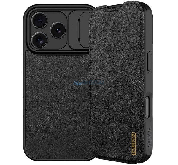 NILLKIN QIN PRO tok álló, bőr hatású (FLIP, oldalra nyíló, kártyazseb, kameravédő) FEKETE Apple iPhone 17 Pro