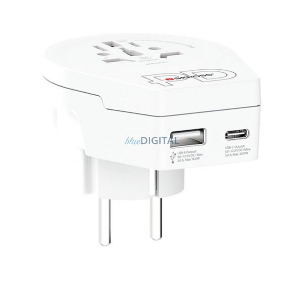 SKROSS utazó töltő USB+Type-C aljzat (250V/2.4A, 20W, EU2 pin - AUS/CH, UK, USA/JPN, CHE, IT, BRA, földelt) FEHÉR