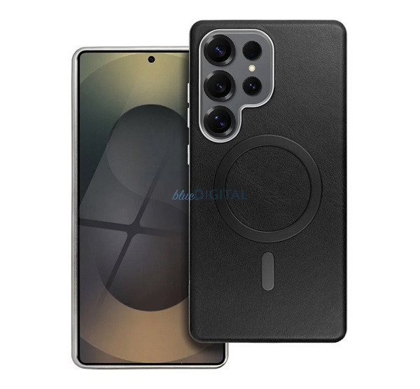 Szilikon telefonvédő (ECO bőr hatású hátlap, karcolásmentesítő belső, fém kameravédő, MagSafe, prémium) FEKETE Samsung Galaxy A17 5G (SM-A176)