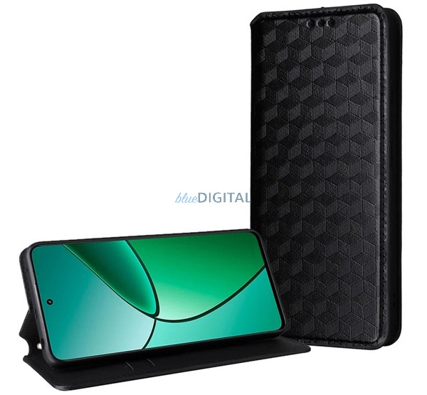 Tok álló, bőr hatású (FLIP, oldalra nyíló, asztali tartó, teljes 3D rombusz, prémium) FEKETE Xiaomi Poco F7